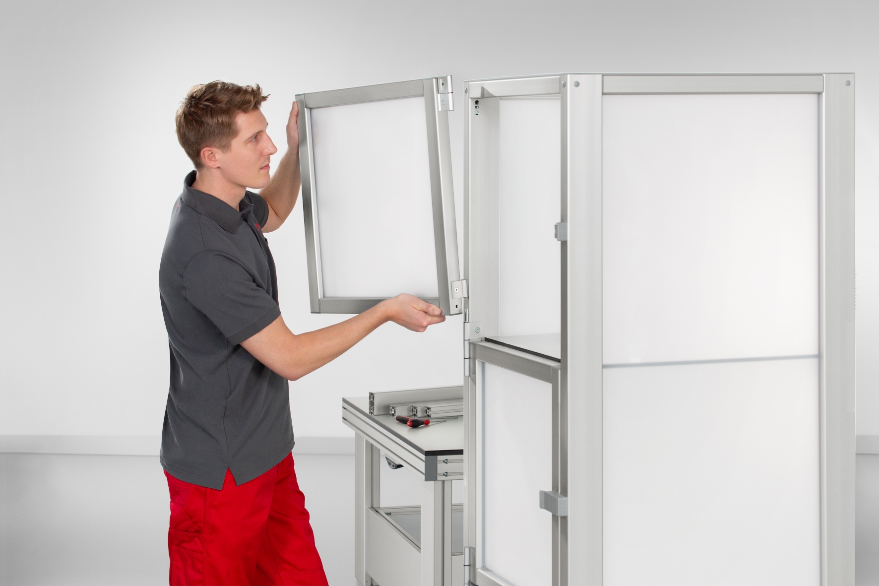 The modular components in the item MB Building Kit System are constantly being expanded and adapted to new requirements. The new Profile 8 NO light, for example, is particularly easy to clean thanks to its smooth, unbroken surface, which radiates elegance and offers an appealing design for frames, enclosures and doors. The profile comes in two designs, 40x40 3NO light and 80x40 5NO light, which each feature one open and three or five closed grooves respectively. No milling is needed to open the profile groove cover – a hand tool such as the item T-Slot Opener 8NO is all it takes. Profiles 8 NO light are ideal for use with the new Hinge 8 N/NO Al PP4. In this case, users only need to open up a small area of the groove cover for fixings. Compared to Hinge 8 Al PP4, light duty, Hinge 8 N/NO Al PP4 light has a shorter anti-torsion feature. It comes as a complete set with fastening materials and can carry a load of up to 500 N. When fitted between a door and the frame, there is a narrow door gap of 4 mm. The fastening screws are concealed on the outside of the door by the profiles and are covered over when the door is closed, making them inaccessible. This creates door frames with smooth surfaces without visible screws, openings or fixing components.