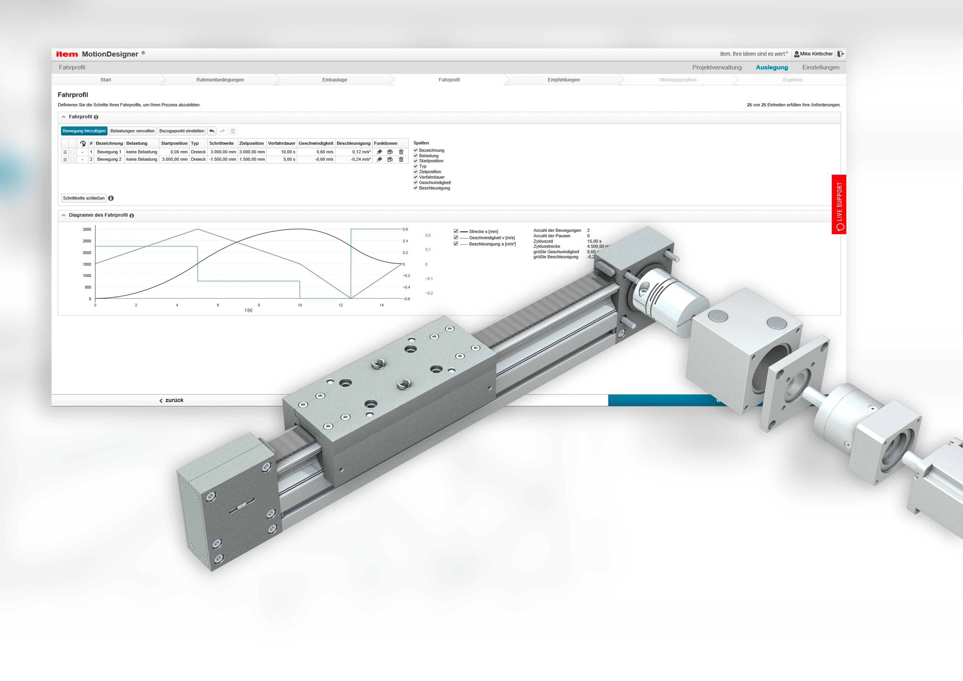 Caption 4: Based on the underlying conditions for the transport task, item Motion Designer® puts together an optimum turnkey solution comprising Linear Unit, Motor, Controller and Gearbox. Source: item