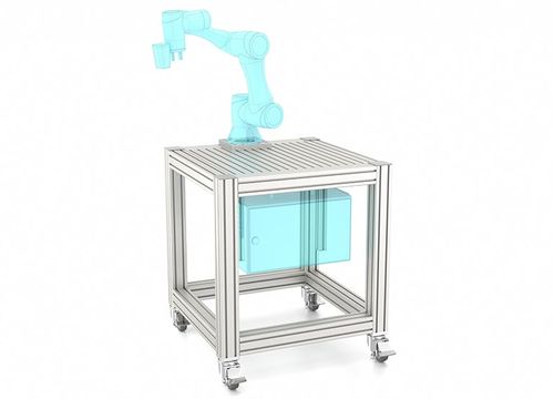 EX-01224This work bench island is easy to expand and has everything you need for using a cobot. Profiles XMS with their integrated cable conduit safely accommodate cables and operating elements. Thanks to the variable Groove Plate, the robotic arm and accessories can be positioned wherever they are needed. The frame provides storage space and room for the control system. Every dimension of the basic design can easily be adapted to your working environment during the planning stage. The frame is compatible with the item MB Building Kit System, enabling the use of the entire portfolio of profiles, Castors, Adjustable Feet and accessories.